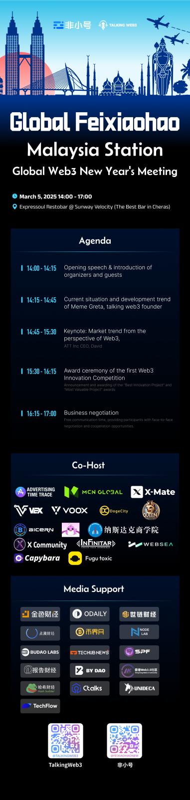 On March 5, 2025, the Feixiaohao Global Tour | 2025 Web3 New Year Meetup will be grandly held at Sunway Velocity in Malaysia! Co-hosted by Feixiaohao, Talking Web3, and Nasdaq Business School, the event will focus on global Web3 development trends, bringing together industry leaders, top projects, investment institutions, and community representatives to discuss the latest opportunities and challenges in areas such as AI-driven crypto trading, RWA (Real World Assets) digitization, Meme economy, GameFi, and DeFi.