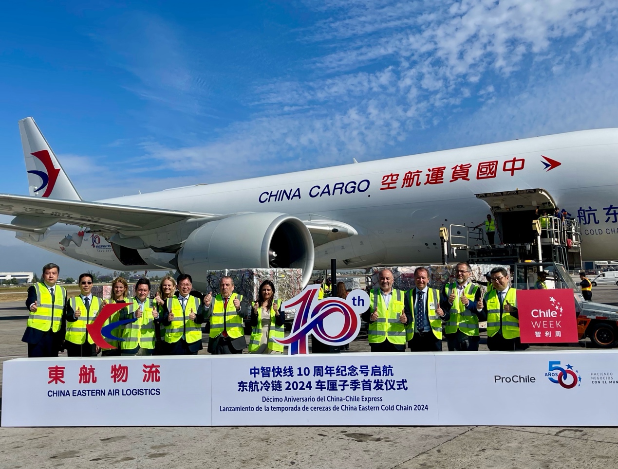 Around 10 am on Nov. 20, 2024, a China Eastern Airlines Boeing 777 freighter, with registration number B-220F, specially painted to commemorate the 10th anniversary of the China-Chile Fresh Express, took off from Santiago, Chile with 76 tons of fresh Chilean cherries.