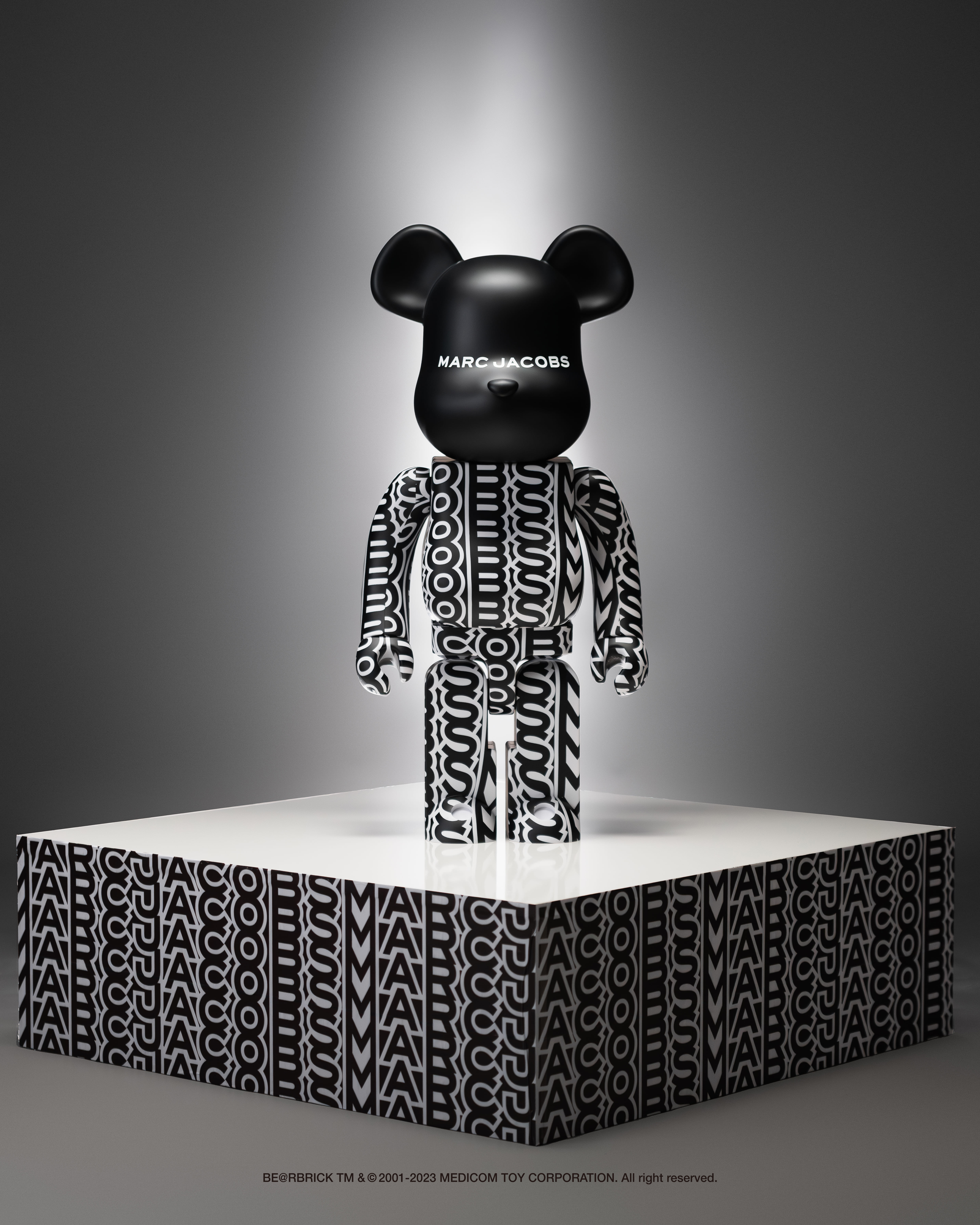 The vertical arrangement of typography embodied in this BE@RBRICK collaboration represents the signature monogram of Marc Jacobs. It exudes electrifying energy, boldly announcing the brand's renewed vitality and fearless self-expression.