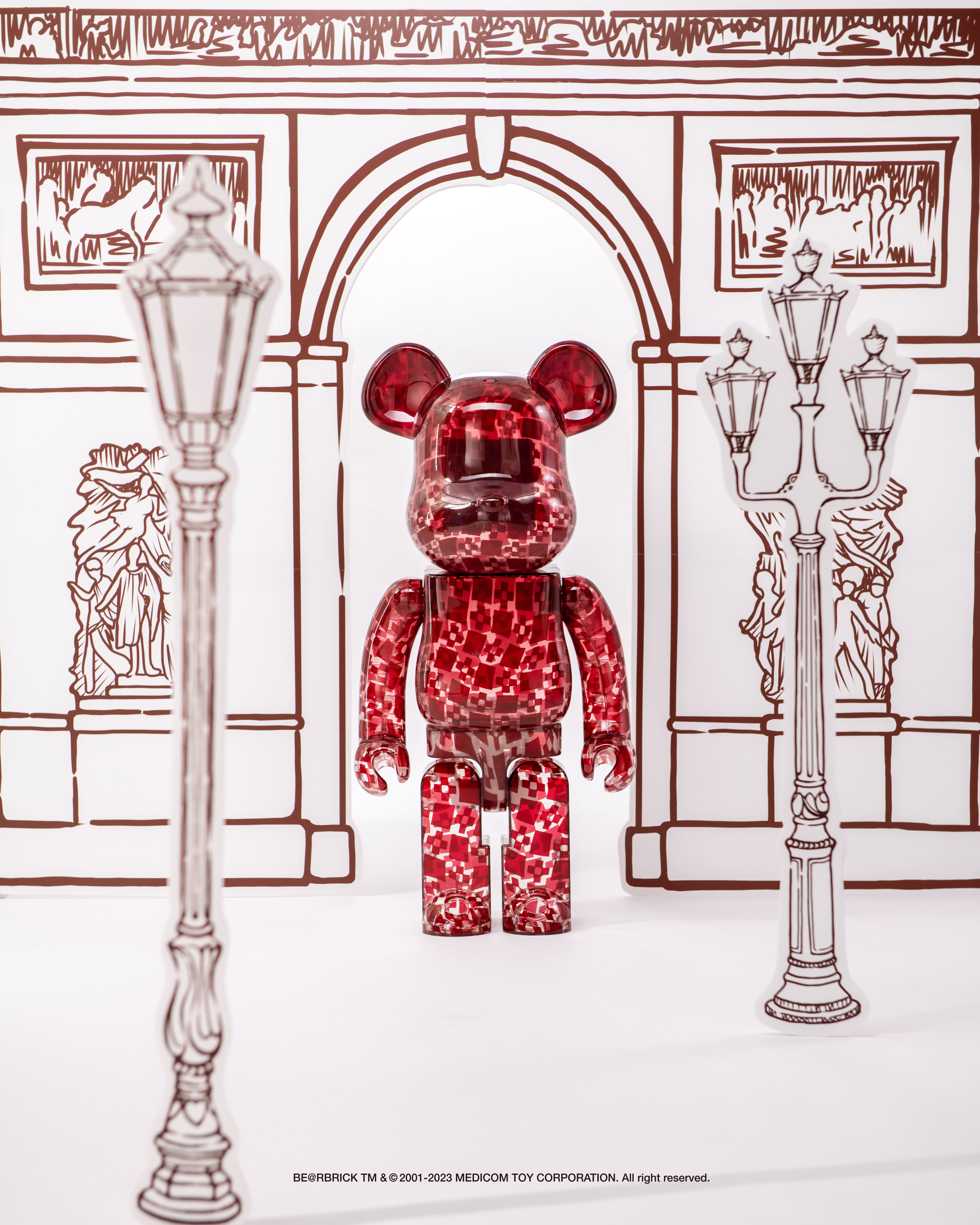 As a strong element of SANDRO’s visual identity, the brand seamlessly incorporates the iconic cross print, blending French modernity with exquisite refinement in this BE@RBRICK collaboration. The print cascades from top to bottom in a gradient of stunning hues of red—it is truly a work of sophistication and contemporary allure.