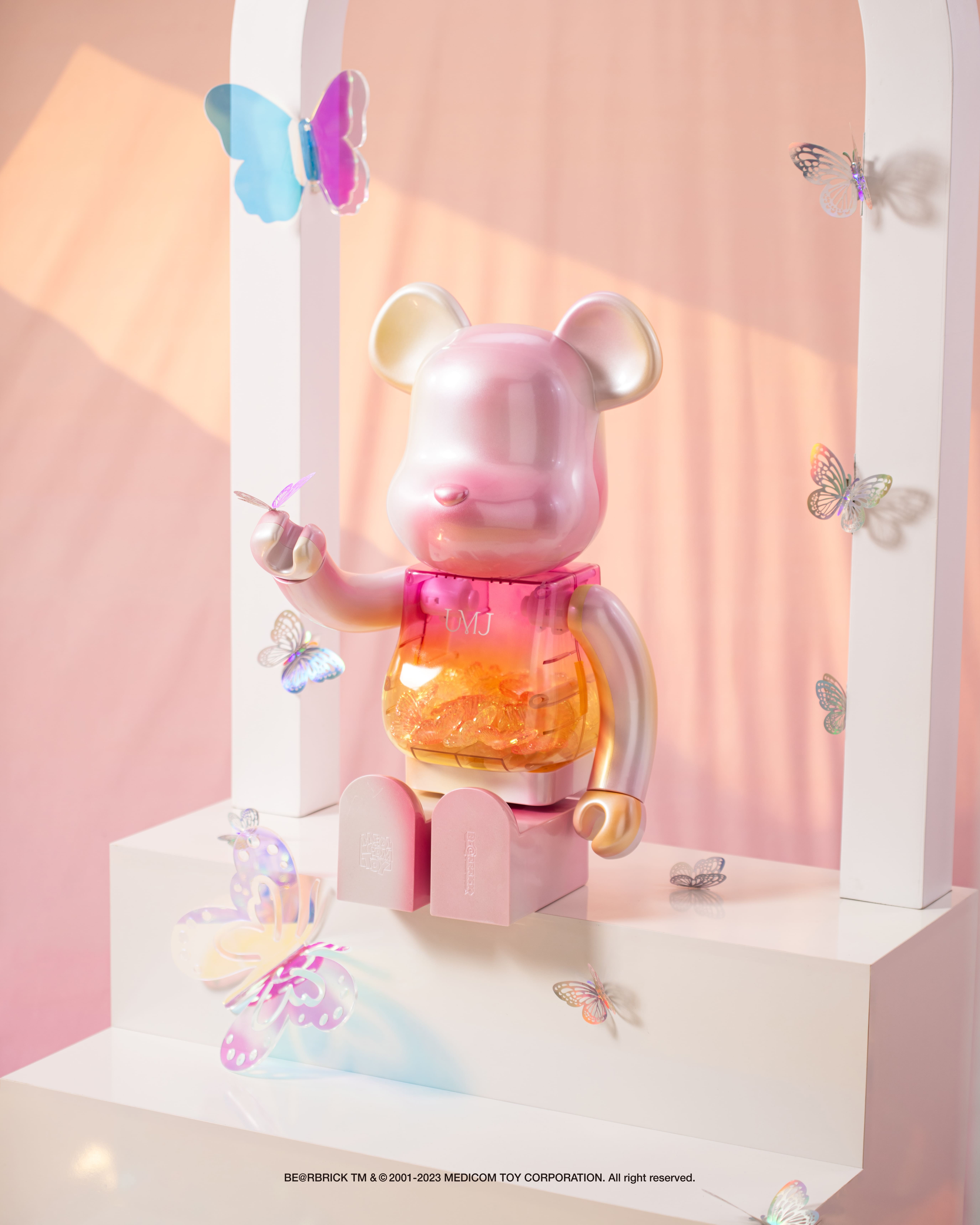 UMJ infuses playful aesthetics and delights as a kaleidoscope of candy-inspired colors into this BE@RBRICK. Celebrating the simple pleasures of life, it unveils a translucent form that holds a whimsical surprise within—delicate butterflies nestled gracefully.surprise.