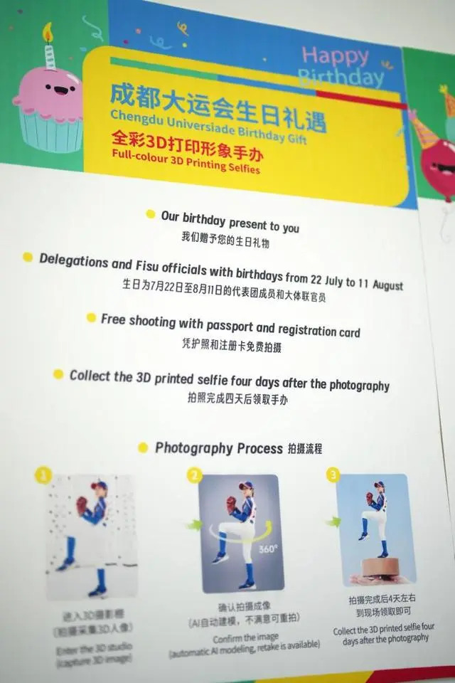 The ongoing 31st FISU World University Games in Chengdu, capital of southwest China's Sichuan Province, offers lifelike 3D-printed figurines as birthday presents to sports delegation members.