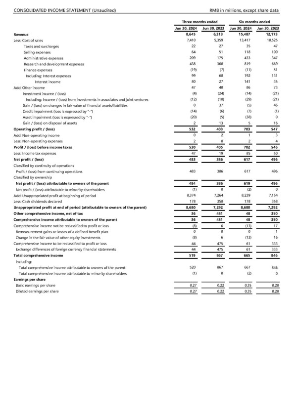 Generated RMB 3.03 billion cash from operations. With net capex investments of RMB 1.87 billion,free cash flow for the first half of 2024 was RMB 1.16 billion.