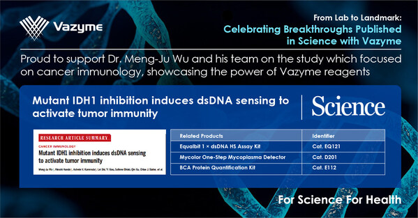 NANJING,China,Sept. 16,2024 -- Vazyme (688105.SH),a leading life science technology company,significantly contributed to groundbreaking research published in Science Magazine through its innovative products. The study,which focuses on how mutant IDH1 inhibition activates tumor immunity by inducing double-stranded DNA (dsDNA) sensing,utilized Vazyme's advanced tools to achieve compelling research results. These findings are driving progress in life science,fostering transformative changes and innovations,and advancing both academic research and the broader medical sector.