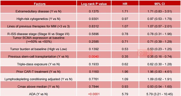 Among baseline characteristics—includingECOG score,R-ISS and ISS disease stages,tumor BCMA expression,tumor burden,baseline sBCMA level,previous autologous stem cell transplantation (ASCT),triple-class exposure,bridging therapy,prior CAR-T treatment,and lymphodepleting conditioning—only previous ASCT (n=30) and ADA as post-infusion factors were significantly associated with Eque-cel persistence,with hazard ratios (HR) 0.35 and 5.79,respectively,as shown in Table 1.