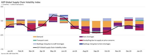 CLARK,N.J.,Feb. 12,2025 --The GEP Global Supply Chain Volatility Index— a leading indicator tracking demand conditions,shortages,transportation costs,inventories,and backlogs based on a monthly survey of 27,000 businesses — posted -0.21 at the start of the year. This indicates that global supply chains are effectively at full capacity,signaled when the index hits 0.