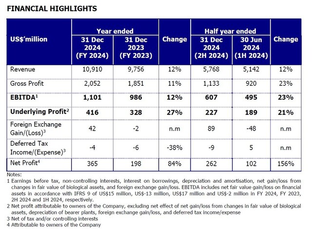 GAR achieved a record sales volume of 11.9 million tonnes in 2024,supporting a 12% growth in revenue to US$10.9 billion. Stronger sales,together with higher CPO prices,combined to offset the impact of lower plantation output. EBITDA for the year increased by 12% to US$1.1billion,preserving a healthy margin of 10%. Underlying profit grew by 27% year-on-year to US$416 million,while net profit increased to US$365million.