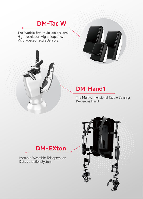 SHENZHEN,China,April 16,2025 --Daimon Robotics officially launched the innovative product line on April 16,including the world's first Multi-dimensional High-resolution High-frequency Vision-based Tactile Sensors DM-Tac W,the Multi-dimensional Tactile Sensing Dexterous Hand DM-Hand1,and Portable Wearable Teleoperation Data collection System,DM-EXton.