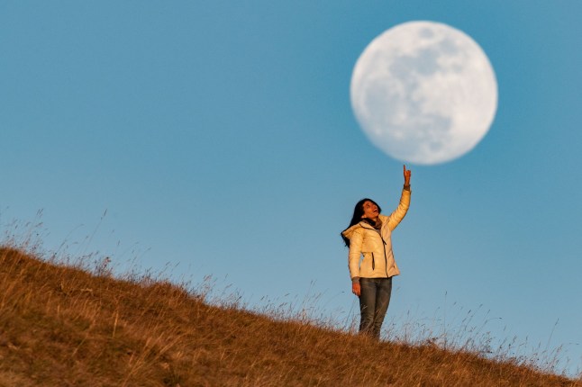 A woman ‘touching’ the Pink Moon in Calascio,Italy,last night (Picture: Rex)