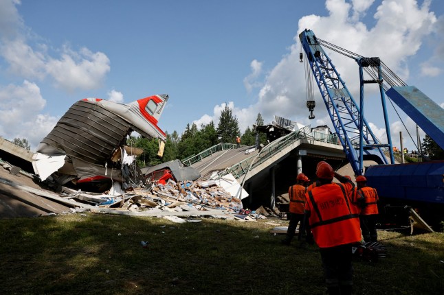 Emergency services work at the scene of the bridge collapse in the Bryansk region (Picture: REUTERS)