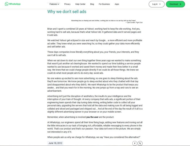 ‘We don’t sell ads’,they said in a 2012 blog post quoting Tyler Durden from Fight Club: ‘Advertising has us chasing cars and clothes,working jobs we hate so we can buy shit we don’t need.’