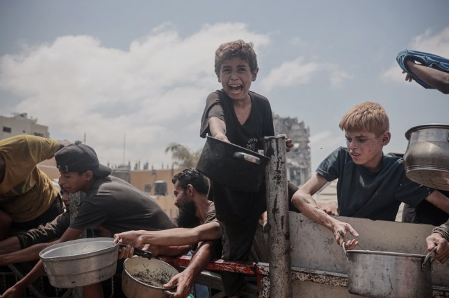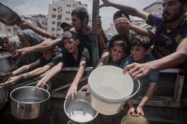 Palestinians,facing food shortages due to Israel’s blockade and ongoing attacks on the Gaza Strip,gather with pots and pans as a charity distributes meals in western Gaza City (Picture: Anadolu via Getty Images)