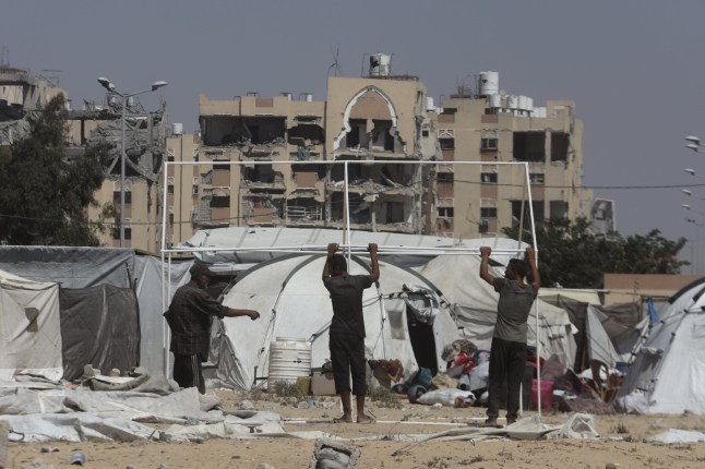 Displaced civilians struggle to survive and set up tents in the limited empty spaces of the Hamad City residential area,which was heavily damaged in previous attacks,in Khan Yunis,Gaza (Picture: Getty Images)