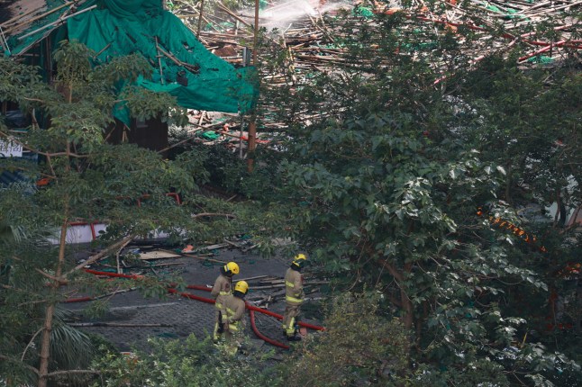 Firefighters inspect the affected area in the aftermath of the Tai Po apartment fire in Hong Kong (Picture: EPA)