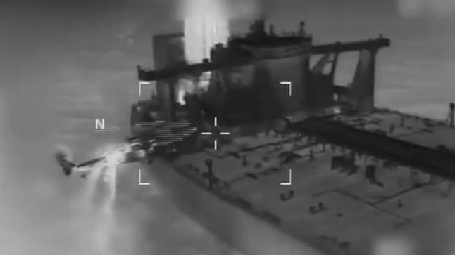 A helicopter approaches one of the oil tankers and soldiers are seen rappelling onto the vessel and moving to the bridge